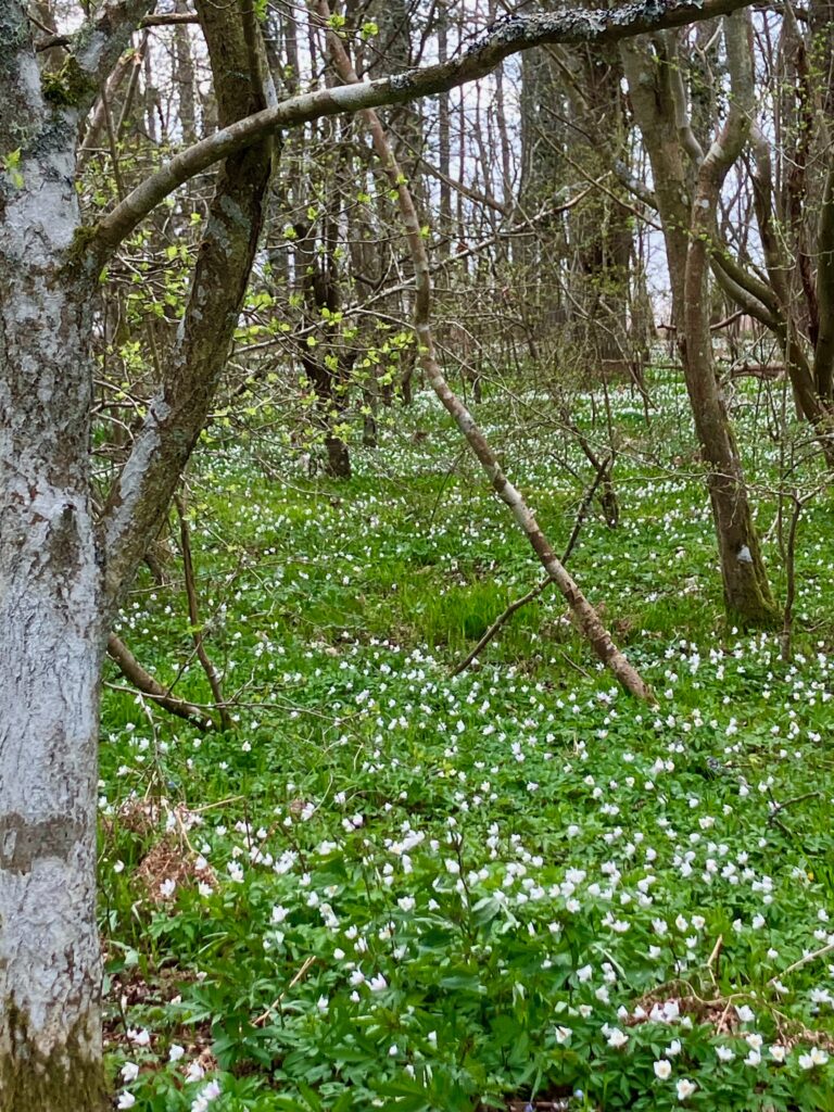 Det är också vitsippornas tid. Och blåsippornas! Som jag har letat, men nu har jag funnit platsen där blåsopporna vill vara. Så vi tar promenaden också genom det vajande vita. Känner doften av nygrönska. Och där nånstans stoppar jag näsan djupt i de små ljuvliga blå.