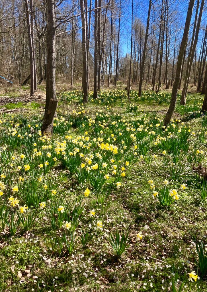 Sommarens primörer sås och och potatisen hamnar i jorden. Måstre sträcka på benen och ryggen. Vi gör det med en promenad till narcisslunden. Varje vår förundras jag över att att se detta överdåd av påsk- och pingstliljor. Det har en gång legat ett trädgårdsmästeri intill. Från när jag var liten minns jag flera stora växthus som nu är nedtagna. Ett hav av förvildade vårblommande lökar minner om en trädgårdsmästare.